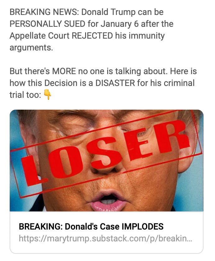 COURT BLOCKBUSTER: Donald can be PERSONALLY SUED for January 6 after Appellate Court REJECTS immunity. Decision is a DISASTER for his criminal trial. Read why.👇