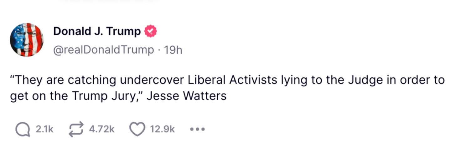So far, here’s the pattern: A Fox personality attacks the judge or jury, and then Donald shares it on Truth Social as a way to give himself plausible deniability: He can distance himself from the quote by saying it doesn’t represent what he actually believes.