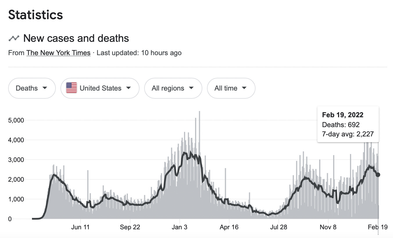 The 7-day rolling average of COVID deaths last week was 2,227, down 14% from the preceding week. This means that we continue to lose over 2,000 Americans every day, needlessly, to COVID. These are as many daily deaths than during the first terrifying wave of the pandemic in March and April of 2020 (which, by the way, seems like several centuries ago). Our response to this level of death now is very different from what it was back then.