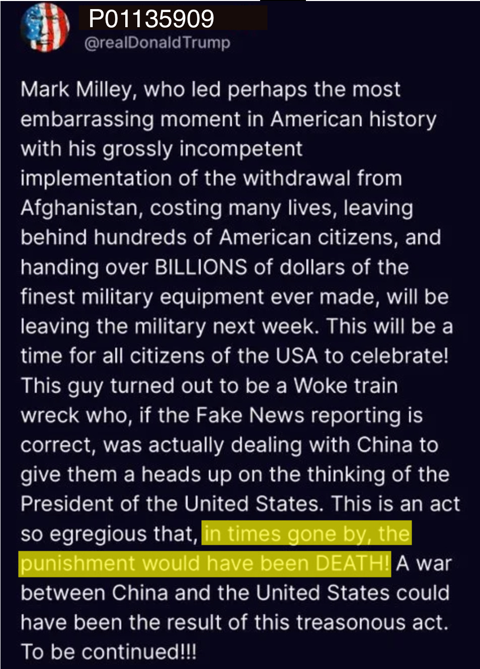 Do we think his amped up followers, who’ve been wallowing in the juices of Donald’s grievances for over six years now, are going to read Donald’s post as mere historical commentary? No. Neither does Donald. That’s why he posts such things. He knows what his followers will believe after reading, “in times gone by, the punishment would have been DEATH.” They will believe that Gen. Milley betrayed Donald and therefore deserves to die.