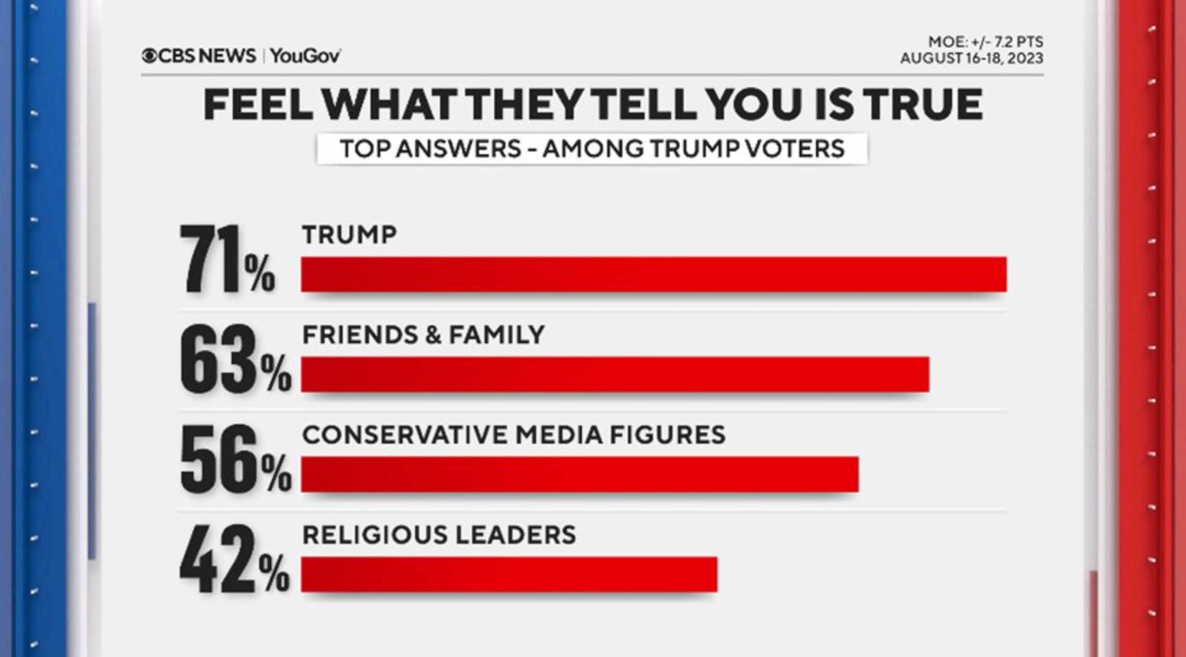The category of respondents in this poll isn’t very well-defined. Are the “Trump voters” polled people who voted for him in 2020 and/or those who plan to vote for him in 2024 ? Also, the n isn’t specified and the margin of error is large. I don’t put much stock in this kind of poll, but we can still infer two things from the results. First, a not-insignificant percentage of the American electorate (in the tens of millions) claim they trust a man who, according to Washington Post fact checkers, told 30,573 public lies during the four years of his administration. (The Post never made the distinction between public and private lies—perhaps they assumed it was implied—but I think it’s important to make that clarification; if we also consider how many lies he told privately, Donald was likely lying almost as often as he was exhaling). Second, anybody who believes Donald Trump at all let alone more than those they are close to is past reaching. I don’t trust conservative media figures or religious leaders on the right, either, but the idea that people exist who would trust Donald Trump more than or as much as their family or (especially) their friends, is gob-smacking.