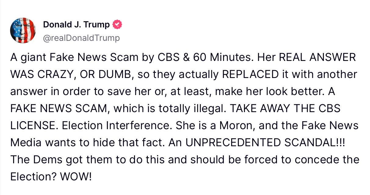 Last week my uncle announced they he was refusing to participate in the candidates’ traditional pre-election interview on 60 Minutes because they insisted upon—gasp!—fact-checking him. Since then, he’s been openly calling for CBS, the network that hosts the news show, to lose its broadcasting license.