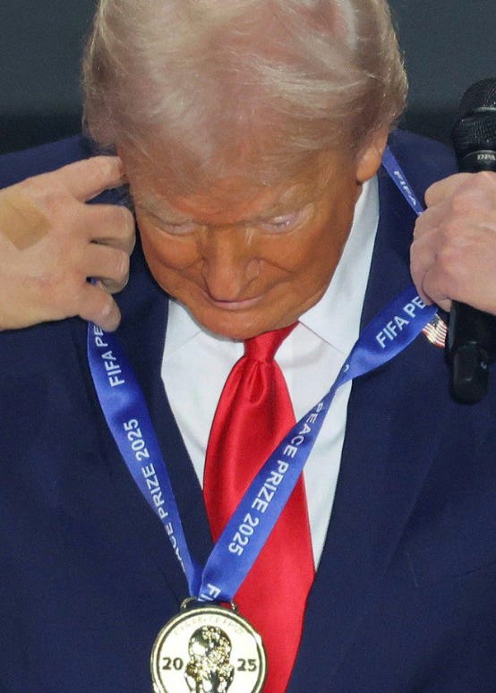Last week, the president of FIFA, (International Federation of Association Football), Gianni Infantino, gave Donald a fabricated and meaningless honor for reasons that should be obvious. Becuase Donald keeps murdering people on boats in the Caribbean Sea and starving children, he will always be ineligible for the Nobel Peace Prize that he so desperately craves. So the powers that be at FIFA came up with the “FIFA Peace Prize.” When Infantino bestowed Donald with the prize saying, “This is your peace prize. There is also a beautiful medal for you that you can wear everywhere you want to go,” Donald grabbed the medal and said: