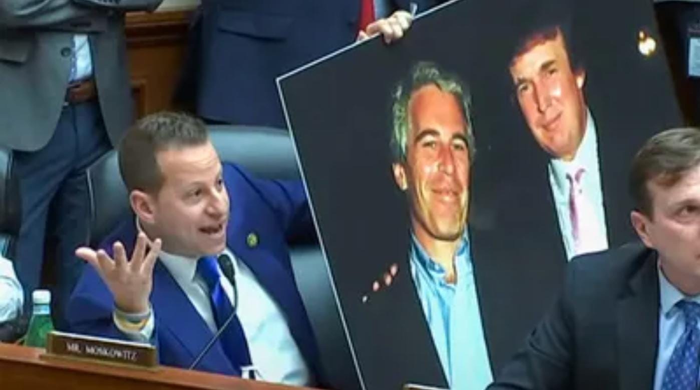 First, Rep. Jared Moskowitz, knowing the right wing is obsessed with Jeffrey Epstein, brought in an enormous photograph of Donald and Epstein together, and then, over Republicans objections, they refused to take it down. During a brief recess taken to get Marjorie Taylor Greene under control, Moskowitz waved the picture around to mock her.