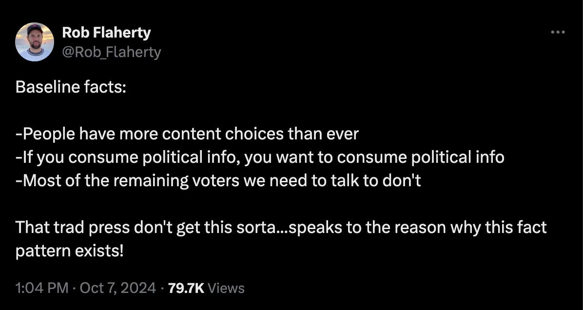 “If data suggested that doing an ABC interview every day until election day would reach the voters needed to win, both campaigns would probably do it,” Maxwell Tani, Semafor’s media editor wrote on Twitter. “The fact that they decided to spend this much time doing podcasts says more about national media’s reach than anything else.”