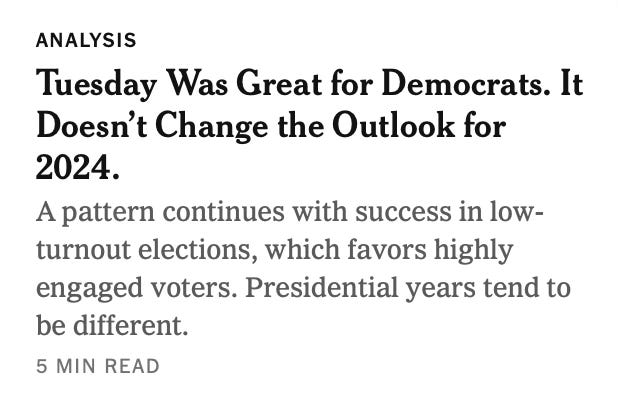 Despite the victories—and they were decisive and widespread, from school boards in Iowa and Pennsylvania to state legislatures in Virginia and New Jersey—the corporate media seemed less-than enthusiastic about what they might mean for the Democratic Party in 2024. Nate Cohn’s analysis was par for the course: Democrats who helped secure wins for the party don’t like Joe Biden and he remains weak going into general elections season; therefore, Tuesday’s results change nothing.