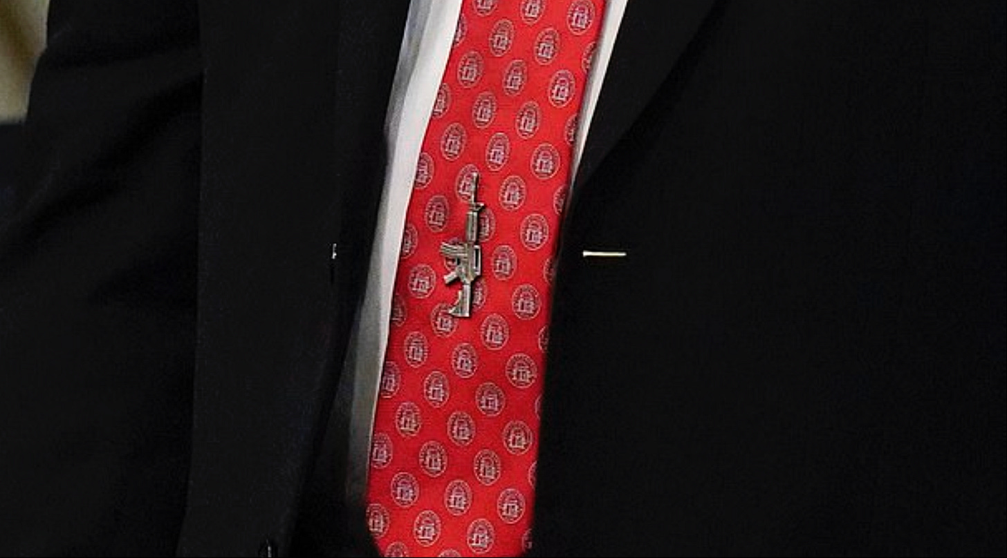 All right. Here we go. What should be getting more attention but isn't is that a few MAGA Republicans have decided to replace their American flag lapel pins with AR-15 pins in a country which has more guns than people, and the fact that we have over 50 mass shootings in year 2023, and it's only February. In fact, I think it's only the third day of February.