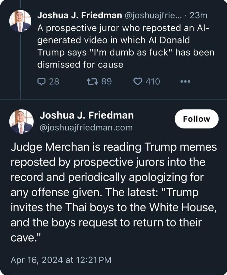 What Donald doesn’t understand is that the American people have a lot of respect for the judicial process, and jurors take their jobs very seriously. That’s why people like Paul Manafort, even with Donald Trump supporters on the jury, was found guilty; that’s why a jury ruled against Donald in one of the E. Jean Carroll cases. They understand that they are not there to be fans or followers — they are there, as judges instruct them, to be finders of the facts. And if the facts aren’t with you, which Donald knows they're very often not, what do you do? You tell people to lie to get onto a jury to help you get a mistrial.