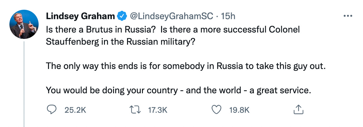 You can bet that Russia will be playing Lindsey Graham's tweet on a loop on state T.V. There is nothing more helpful to the Russian leaders than to convince their people that the evil United States politicians want to assassinate the leader of the "Great Russian Empire". My point is; Lindsay Graham's tweet was quite helpful to Putin!
