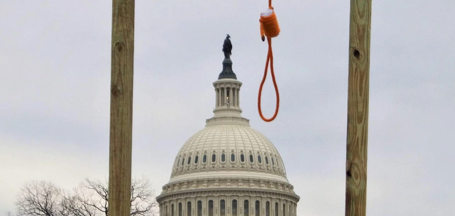 Of course, the election was legitimate and Mike Pence had no authority to send anything back to the states. By phrasing it the way he did, Donald led many people to believe that Pence actually did have the authority to overturn the results, a lie which ultimately put his life in danger. After a gallows, complete with noose, was erected outside of the Capitol building, the mob called for Pence to be hanged.