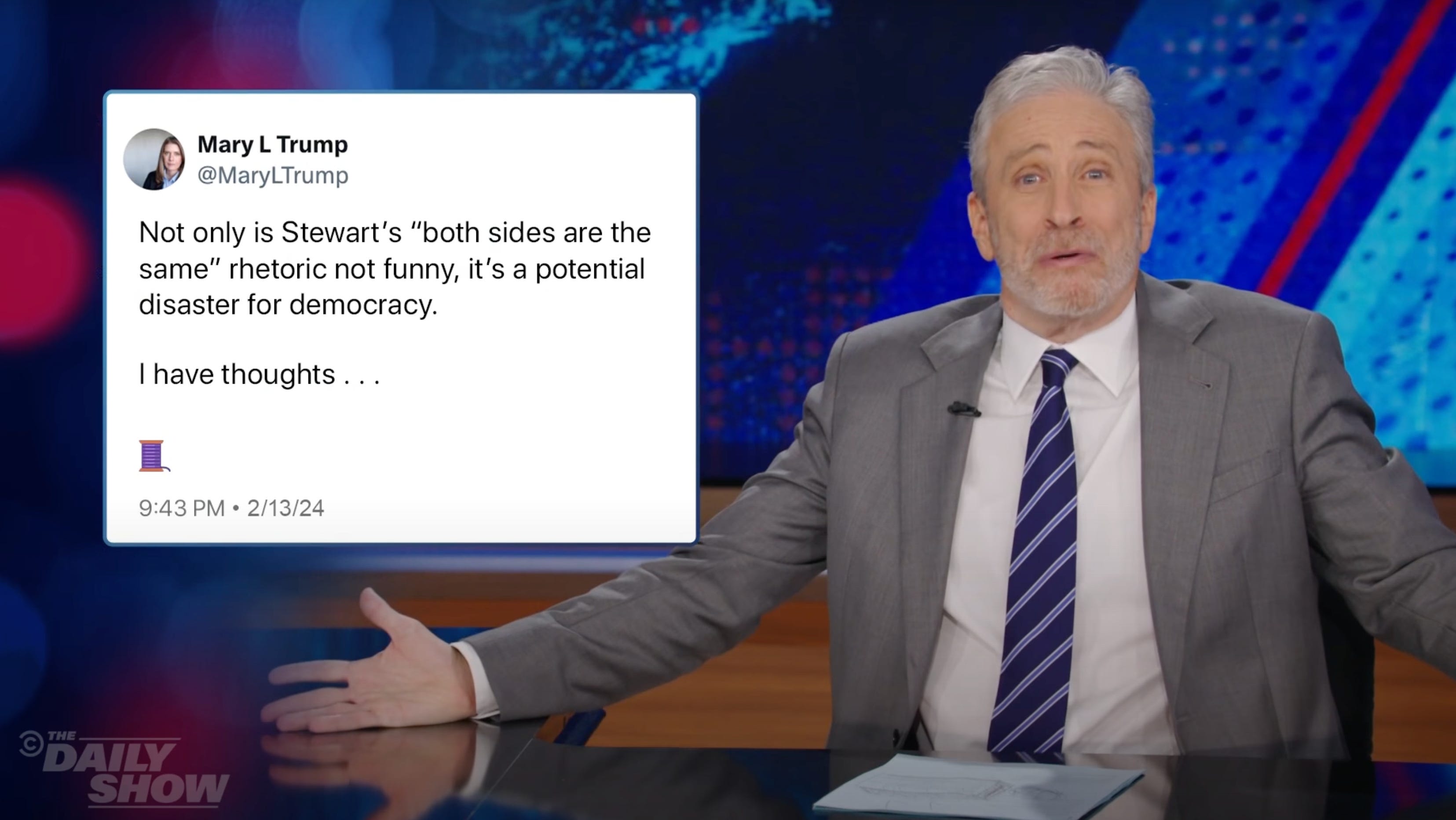 This is the kind of false both-sides-isms I was calling out. I find it dangerous, coming from an incredibly influential public figure, because it leads to voter apathy, which is unacceptable in an election year when the candidate leading one side threatens to eliminate our democracy and the candidate leading the other seeks to strengthen it. My take was overwhelmingly supported by you, The Good in Us community, which is apparently how Stewart heard about it in the first place!