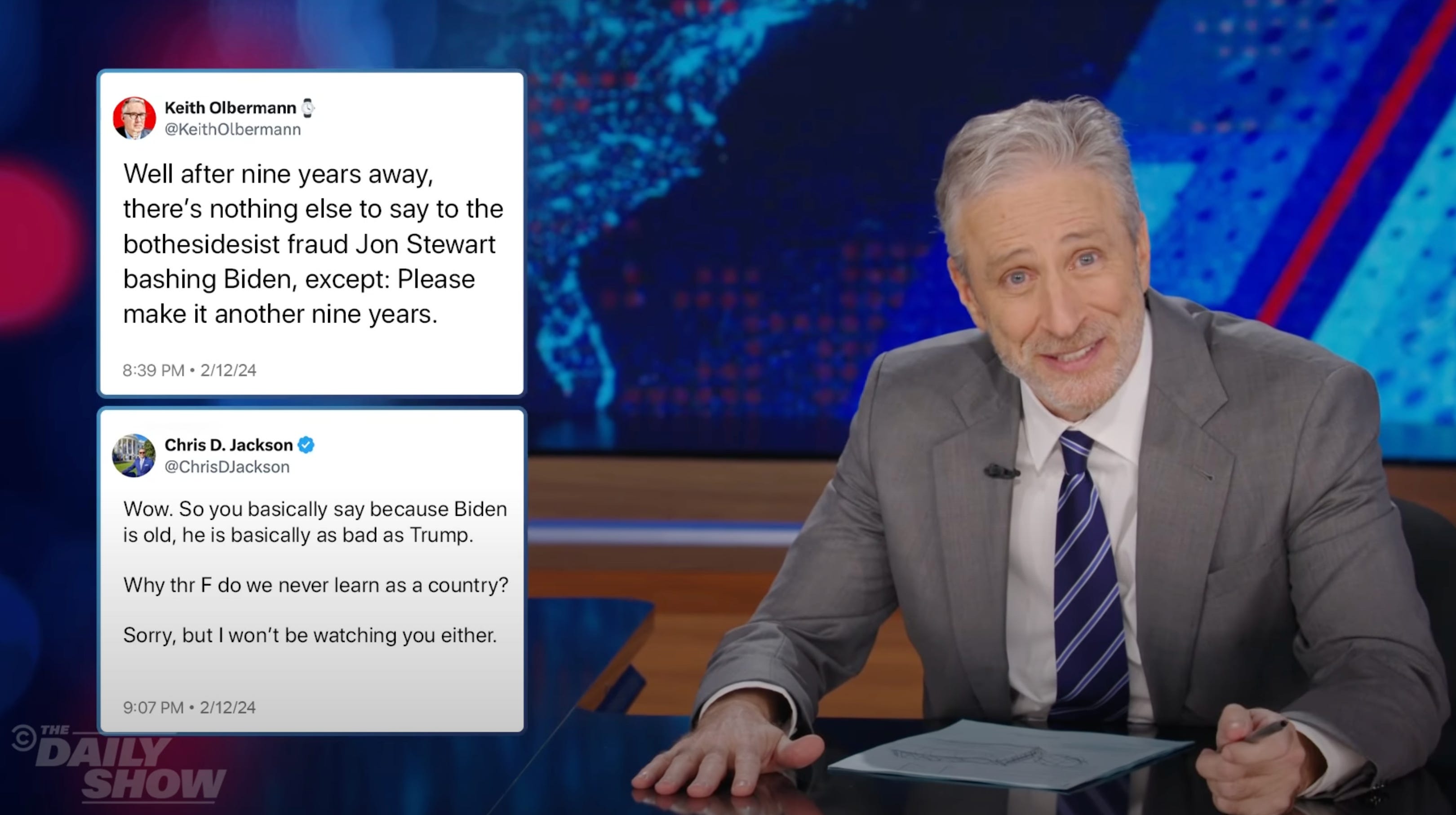 Stewart was back for his second show on Comedy Central’s The Daily Show, and apparently felt the need to respond to my very real concerns over his dangerous both-sides-ism last week, when he equated President Biden and Donald.