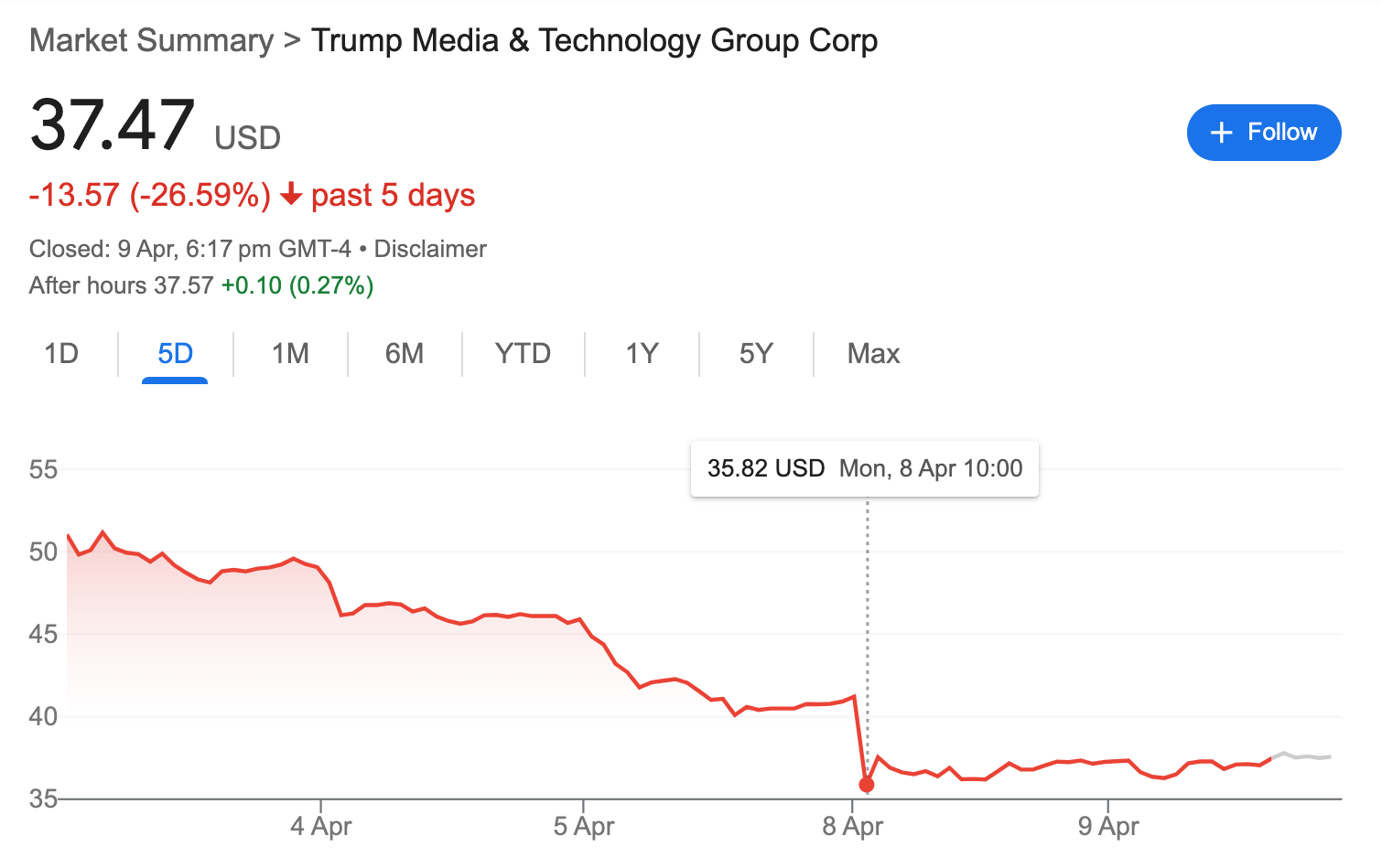 Truth Social’s parent company, Trump Media & Technology Group, has been in a free fall since it went public. It’s so bad that yesterday’s continued slide of the shares’ value erased all gains since the DJT stock began trading.