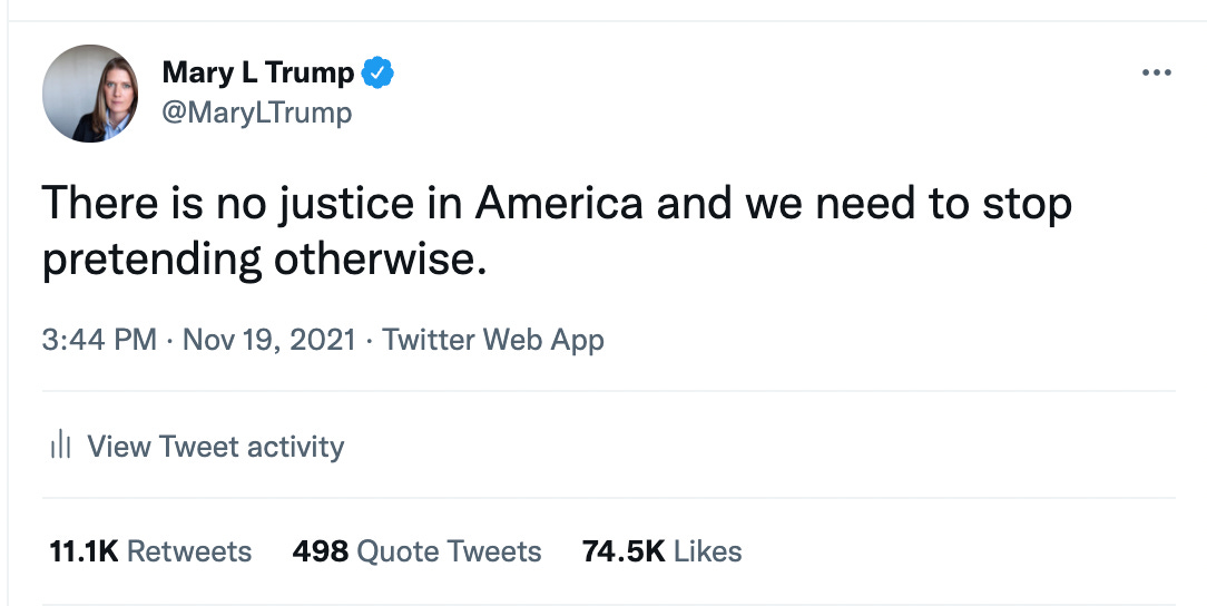 The past few weeks, with the trials of Rittenhouse, McMichael and Bryan, and the Charlottesville trial, has got me thinking about American justice--and its absence. Shortly after the Rittenhouse verdict I tweeted this: