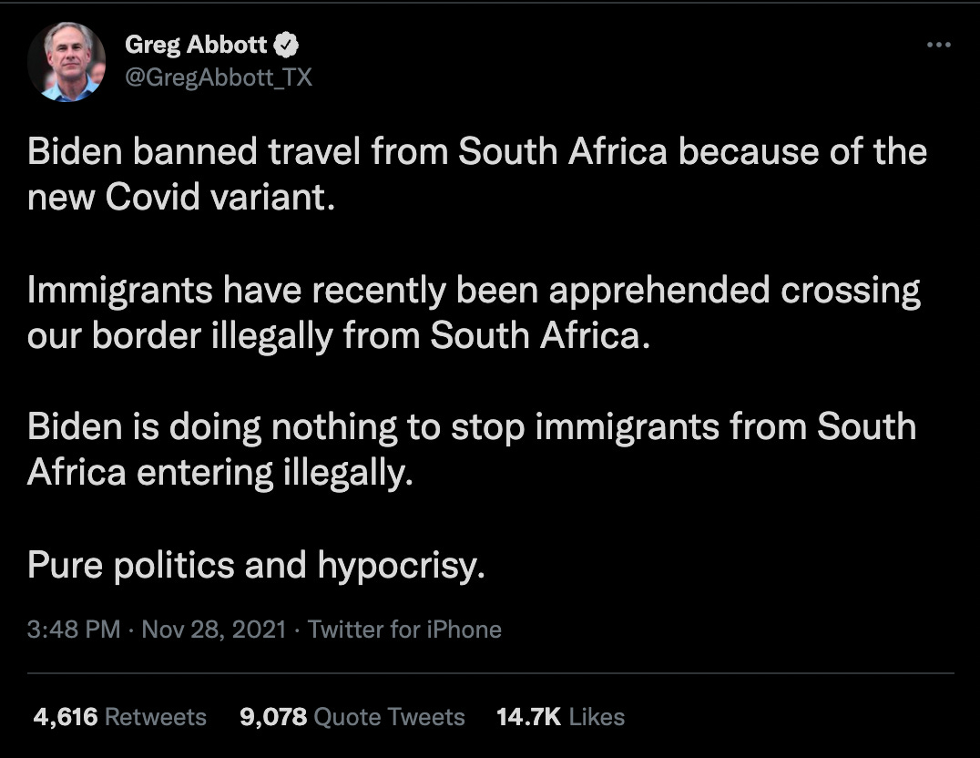 Greg Abbott is Governor of Texas, which helps makes some twisted sense of the news coming out of Texas. Yesterday he got some attention not because he’s ginning up racist fears about the omicron variant of COVID-19 discovered in South Africa. No, he’s concerned the variant is going to make its way over the non-existent border between the United States and . . . South Africa? Somebody generously explained he must have confused South Africa with South America. Last I checked we don’t share a border with South America either. It should come as no surprise that Texas ranks 34 in education. Here’s the tweet—and he still hasn’t taken it down!