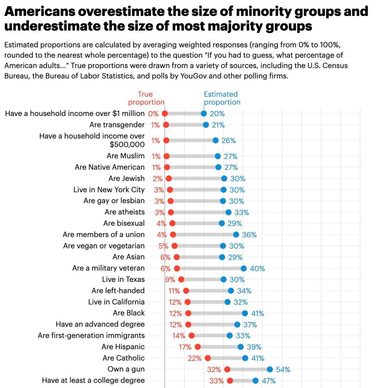 Statistician Dr. Kareem Carr wrote, “Beginning to understand why so many Americans are obsessed with trans issues and panicking about being replaced. They think there are 21x more trans people, 27x more muslims, 15x more jews, 5x more asians, 3x more black people, and 2x more immigrants than there actually are.”