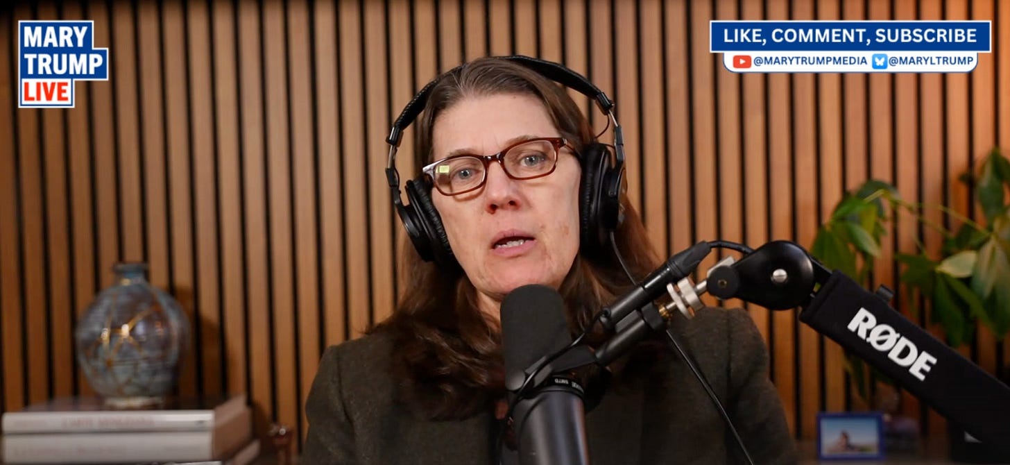Hello, everybody, and welcome to this evening’s episode of Mary Trump Live. It is good to be here with you. There is a lot going on right now. Honestly, it can be difficult to keep everything straight, let alone make it relevant and coherent. But here we are.