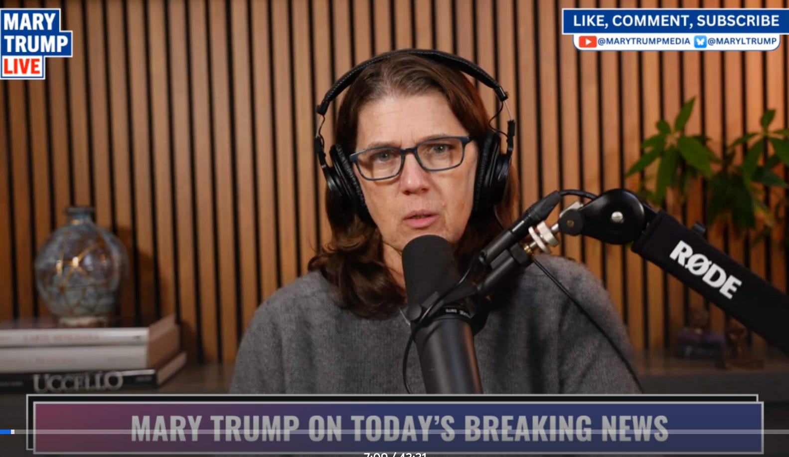 Hello, everybody and welcome to tonight’s episode of Mary Trump Live. It is wonderful to have you here, and it’s great to be back. Thank you so much for tuning in last week, even though I was out, and thank you so, so much to my friends and fellow Nerd Avengers, the most excellent Waj Brown Mary Ali, Brian Karem, and Tara Setmayer for knocking it out of the park. Thanks to all of you for showing up and supporting them. It meant a lot to us.