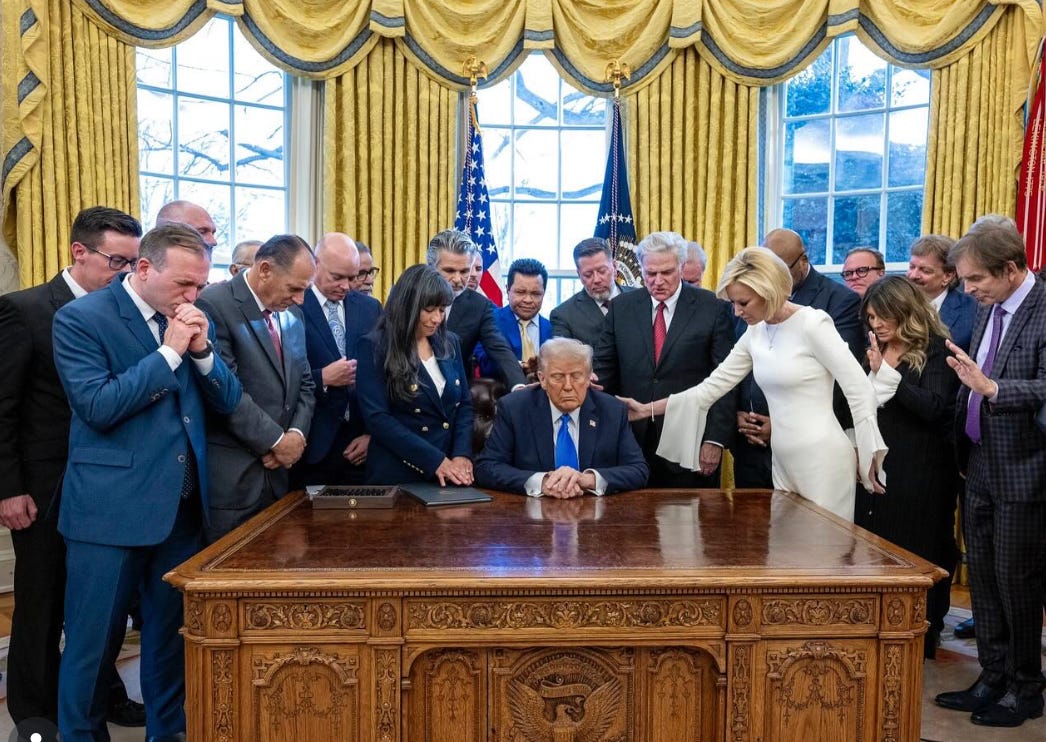 For years now, the white evangelical excuse for supporting somebody as irreligious and sinful as Donald has been to say that he’s an imperfect vessel. White-Cain has left that dubious rationale in the rear-view mirror Now we are told saying no to Donald would be like saying no to God. In a prayer delivered during Donald’s first term, White-Cain framed political opposition to Donald using the language of spiritual warfare: