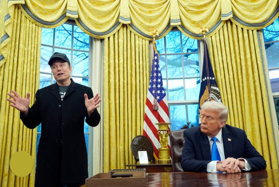 MSNBC's Lawrence O'Donnell called the picture of Donald sitting passively behind the Resolute Desk while Musk towered over him and held court, the most powerless image of a US president ever--and Lawrence would know. In that moment, Elon Musk, without needing to spell it out, showed the world that Donald does not control him. Donald holds sway over some of the other adults in the shot, like the little Nazi Steven Miller, for example, but he is not in control of Elon Musk—and he’s certainly not in control of the executive branch.